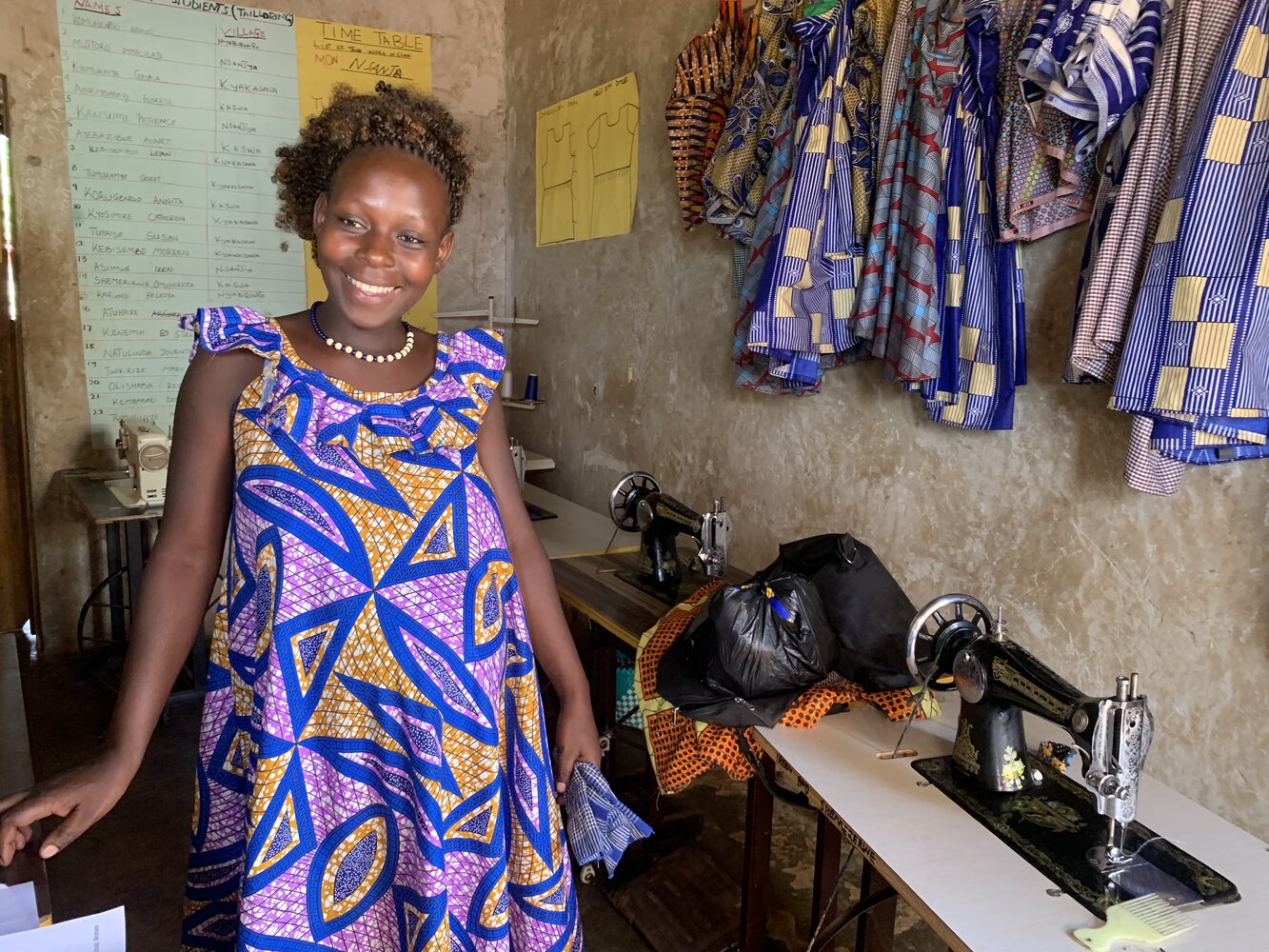 Als ich von der Möglichkeit hörte, eine Ausbildung zur Schneiderin zu absolvieren, war ich sofort begeistert. Ich bat meinen Mann um Erlaubnis, und nach einiger Überzeugungsarbeit – auch mit Unterstützung des Teams der lokalen Partnerorganisation KAWODA* – stimmte er schliesslich zu. So konnte ich an einem sechsmonatigen Training teilnehmen. Mittlerweile gehe ich wöchentlich auf den lokalen Markt, um meine selbstgenähten Kleider für durchschnittlich 30.000 Uganda-Schilling (etwa Fr. 7.50) pro Stück zu verkaufen. Auch die Kleidung für meine ganze Familie schneidere ich selbst, meine älteren Kinder können die Schule besuchen, und unsere gesundheitliche Situation hat sich verbessert, weil wir regelmässiger und besser essen können.