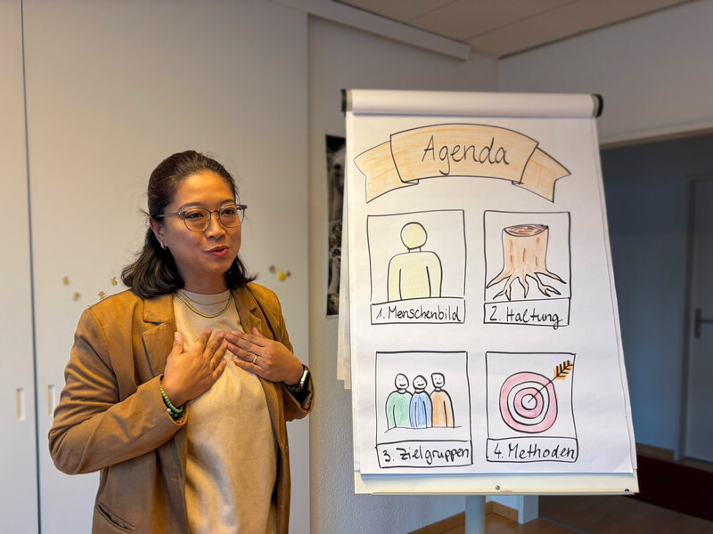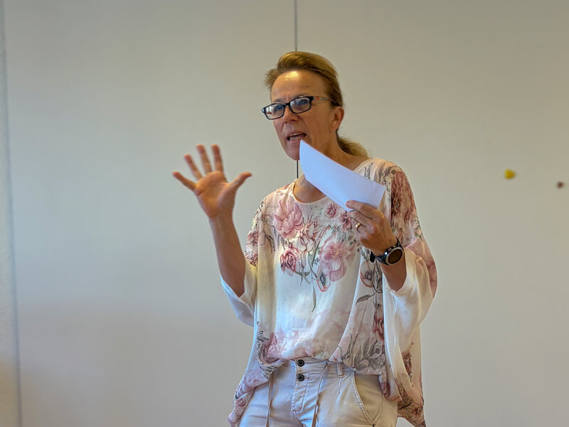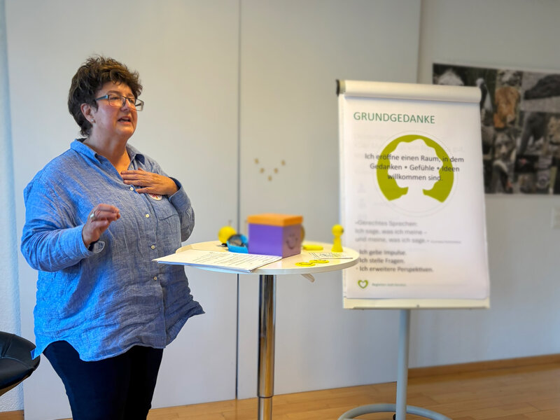 Mit plötzlich ertönender Musik von ihrem Handy eröffnete Sandra Blasucci ihre Präsentation – kein Fauxpas, sondern ihr persönliches Ritual: Musik als Aufwärmer, der ihr Energie und Präsenz schenkt. Diese Einstimmung passt zu ihrem Menschenbild: die Harmonie von Körper, Geist und Gefühl. Kreativität ist für Sandra ein zentraler Wert – auch im Umgang mit Herausforderungen der Freiwilligenarbeit. Trockenere Themen wie Buchhaltung oder Statutenrevision gehören bewusst nicht zu ihrem Repertoire: «Meine Stärken liegen woanders.» Sie möchte Potenziale zum Erwachen bringen, Perspektiven öffnen und Menschen in Veränderungen ermutigen. Methodisch arbeitet sie mit Farben – ein persönlicher, aber gleichzeitig offener Ansatz, der Raum für Gespräche, Deutung und Begegnung bietet. Cornelia Schinzilarz verstand sofort, weshalb starre Strukturen Sandra wenig inspirieren. Sie hob Sandras schöpferische Kraft hervor, die Neues entstehen lässt, ohne den Boden unter den Füssen zu verlieren. Das Plenum dankte Sandra für viele kreative Begegnungen während der Ausbildung. Ihre Standhaftigkeit, ihr Gleichmut und ihre Unerschütterlichkeit wurden besonders betont. Der Mut, mit Musik und Tanz in die Präsentation zu starten, kam bei den Frauen ausgesprochen gut an – ein Ausdruck ihrer Echtheit und Lebendigkeit.