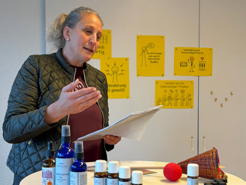 Margrit Bumann stellte die Düfte ins Zentrum ihres Coachingkonzepts – und damit den oft unterschätzten Riechsinn, der Körper und Geist auf besondere Weise berühren kann. Düfte begleiten sie seit vielen Jahren, und daraus entstand ihr persönliches Alleinstellungsmerkmal im Coaching. Mandarine für Aufbruch, rote Mandarine für bessere Kommunikation, Lavendel zur Beruhigung, Rosmarin für Fokus – die Möglichkeiten seien vielfältig, erklärte sie. Weil Menschen intuitiv und häufig unbewusst auf Düfte reagieren, nutzt Margrit deren Wirkung auch in Einzelsettings, um innere Prozesse sanft anzustossen. Ihr Menschenbild ist geprägt von der Überzeugung, dass jeder Mensch einzigartig ist und über Ressourcen verfügt, die Transformation ermöglichen – vorausgesetzt, Veränderung ist wirklich gewollt. Diesen wertschätzenden Fokus brachte sie im gesamten Vortrag zum Ausdruck. Das Plenum griff das Thema mit Humor auf: «Ich kann dich gut riechen» und «Dufte Präsentation», hiess es unter herzlichem Lachen. Besonders gewürdigt wurden Margrits tiefgründige Art und ihr Mut, einen unkonventionellen Ansatz nicht nur zu entwickeln, sondern ihn auch selbstbewusst als USP zu benennen. Zum Abschluss schenkte sie ihren Coaching-Kolleginnen ein kleines Präsent, das – passend zu ihrem Thema – helfen sollte, den persönlichen Fokus zu schärfen. Cornelia Schinzilarz lobte Margrits Zugang über das Unbewusste und Intuitive: Mit gezielt gesetzten Duftakzenten stärke sie den Willen zum Wandel. Aromacoaching sei ein spannendes und bereicherndes Alleinstellungsmerkmal.